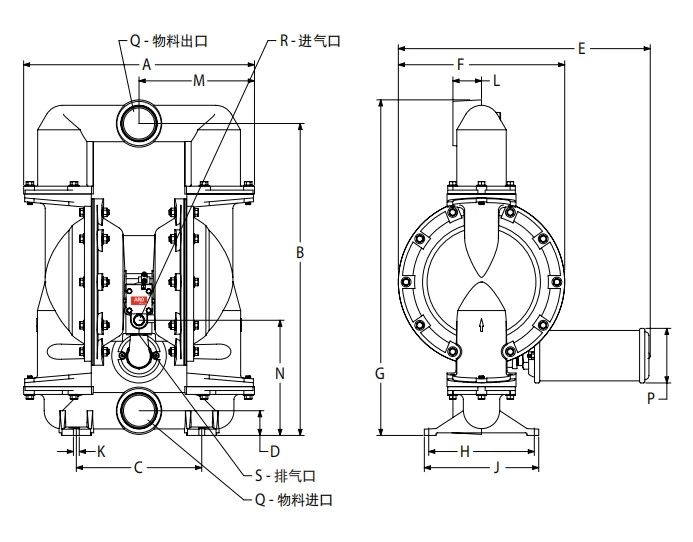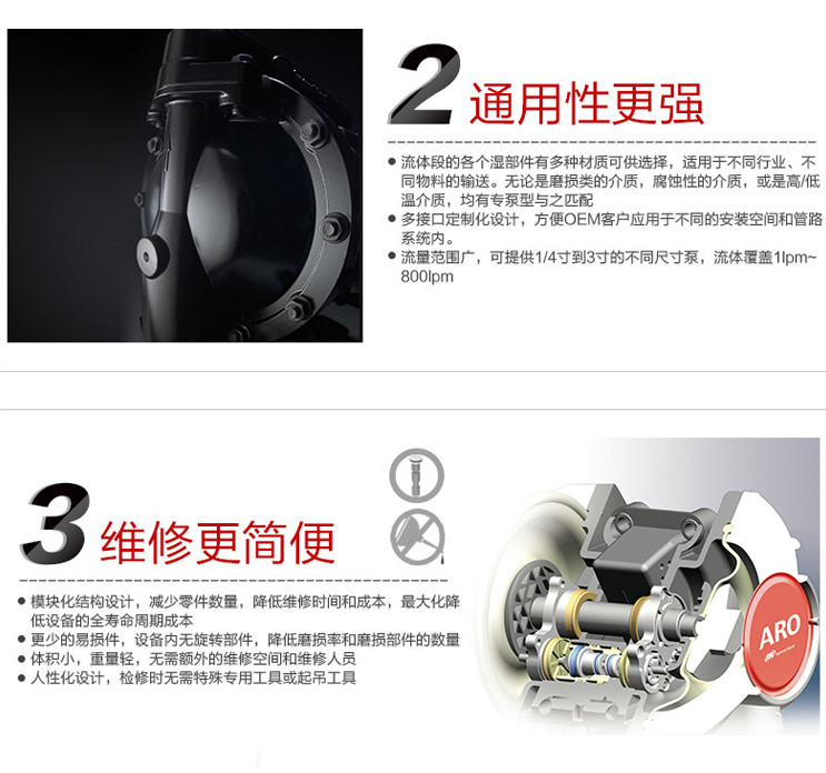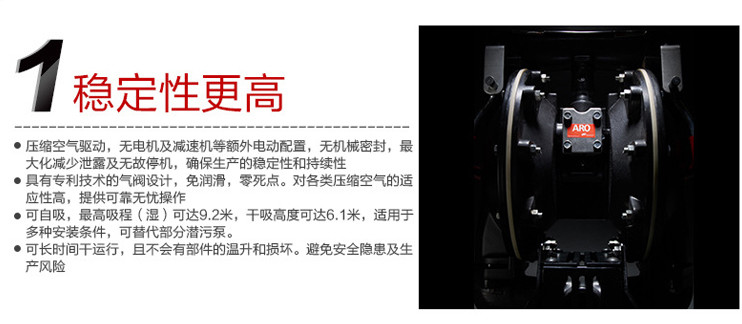 英格索兰ARO气动隔膜泵堪称在行业中全寿命成本最低,有效缩减了购买方在整个运行过程中的设备成本的投资。多样化的材质使其输送的流体极为广泛,我们不仅为磨蚀性较强的工况提供铸铁材质选项,确保泵的耐磨损性,并且为含酸碱的化学性污水提供聚丙烯甚至PVDF等物料选项,防止腐蚀和泄漏。此外,该隔膜泵结构多样化,除了可以输送常规的流体,更能独特的输送粉末。